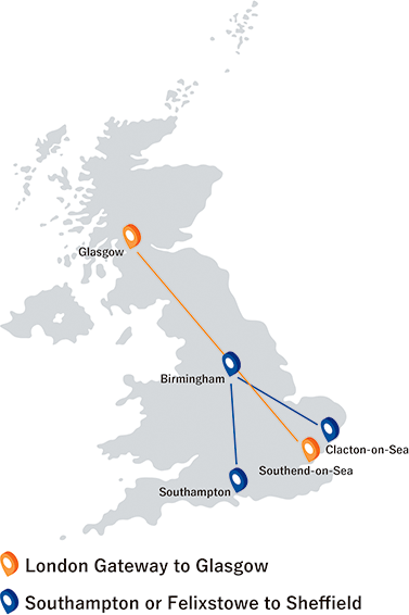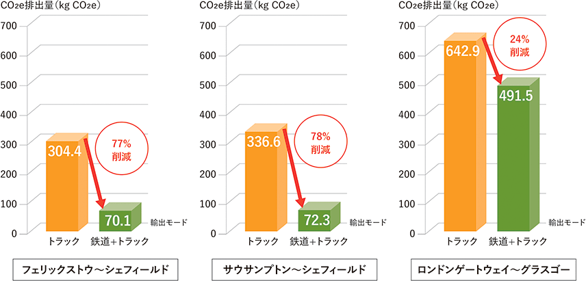 その結果、陸上輸送に伴う温室効果ガス排出量を大幅に削減することができました。具体的には、サウサンプトンまたはフェリックストウ発シェフィールド向けの輸送では、1コンテナあたり約77%(247kg CO2e※)の削減を達成し、ロンドン・ゲートウェイ発グラスゴー向けでは、1コンテナあたり約24%(151kg CO2e)の削減効果が得られました。