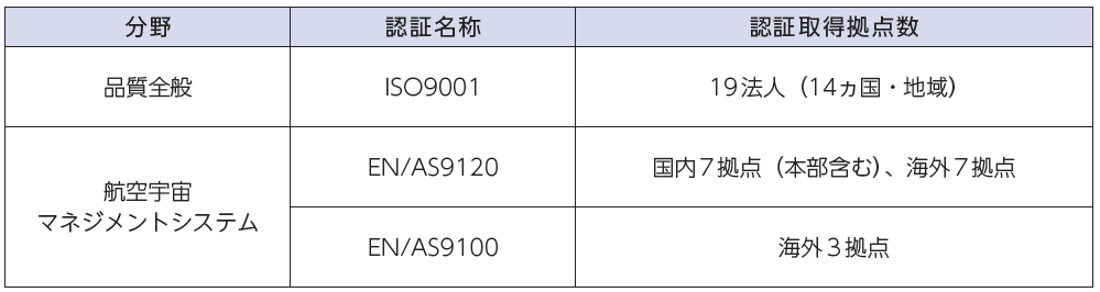 また、ISO9001をベースに安全性や信頼性といった航空宇宙・防衛産業特有の要求事項を追加した航空宇宙防衛品質マネジメントシステム規格であるEN/AS9120の2018年版認証を、国内7拠点と海外7拠点、EN/AS9100を海外3拠点で取得しています。