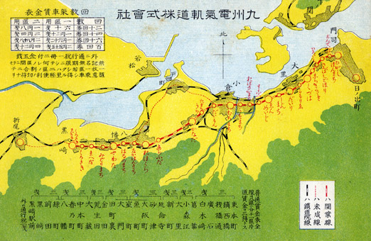 西日本鉄道には当時の発起人会議事録などが遺っており、與八郎が積極的に発言をしていたことが判ります。これは與八郎が博多電気軌道(西鉄福岡市内線循環線など)の計画を具体化する前年にあたり、彼の中には門司ー八幡ー筑豊ー博多間を高速鉄道(電車)で結び、さらに唐津や太宰府などへ路線を繋ぐ大構想があった事がわかります。博多電気軌道の開業を前に、九州電気軌道はひと足先に1911(明治44)年6月に開業。同年10月の與八郎急死後も構想を実現すべく筑豊・博多への軌道出願を続けましたが、ついに実現することはありませんでした。