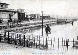 1910(明治43)年に開催された第13回九州沖縄八県連合共進会の付帯施設として箱崎浜に開設されたのが「箱崎水族館」です。筥崎宮外苑の浜辺、現在国道3号線となっている一帯にありました。渡辺與八郎は有力発起人の一人として開設に携わり、博多電気軌道の延長線計画は箱崎水族館を終点としていました(與八郎の急死により実現せず)。当時は福岡市近郊にファミリー向けの娯楽施設は無く、大正から昭和初期まで永く市民に親しまれました。昭和に入ると箱崎浜の埋め立てと国道敷設計画(現在の国道3号線)で敷地の大半を失い、1934(昭和9年)に閉館しています。