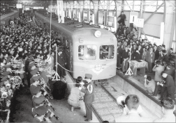 1960(昭和35)年3月、仮営業線と仮福岡駅の工事が着工し同年7月に完成。高架化工事は同年9月1日に着工され、翌61(昭和36)年10月末に竣工して11月1日午前5時10分に高架化された新福岡駅から一番電車が発車しました。