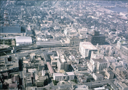 終戦後の1948(昭和23)年、松永の「天神開発」構想の1番の理解者であった岩田屋百貨店の中牟田喜兵衛を中心に、商店主が「都心界(設立時は都心連盟)」を結成し、共同宣伝や親睦会による連携を開始します。さらに1955(昭和30)年には天神地区の多業種100社が集い「天神発展会」が結成され、天神地区の一体開発に向けてのまちづくり活動が始められました。これが今日の「We Love天神協議会」の前身です。
