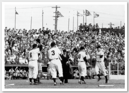 日本シリーズ第1戦、ホームランの豊田を出迎える三原監督、中西・大下両選手。
