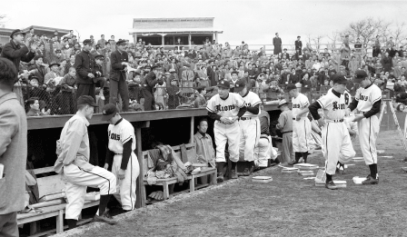 開幕戦の試合前風景。土盛り球場の時代、スタンドのファンと選手の距離は近かった。