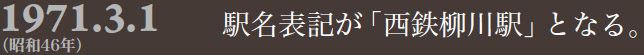 西鉄柳河駅は1965(昭和40)年12月にホーム跨線橋が設置され、さらに1971(昭和46)年3月1日に漢字表記を変更し「西鉄柳川駅」と改称されました。